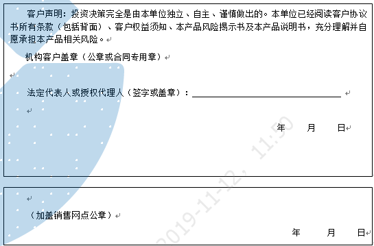 客户签名: ( 客户声明:投资决策完全是由客户独立、自主、谨慎做出的。客户已经阅读客户协议书所有条款(包括背面)、客户权益须知、本产品风险揭示书及本产品说明书,充分理解并自愿承担本产品相关风险。)