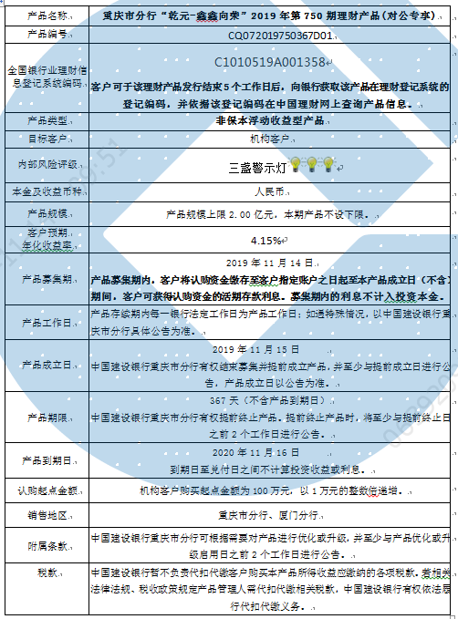 3.中国建设银行重庆市分行可根据市场情况等调整产品规模上、下限,并最迟于调整规模上下限当日进行公告。