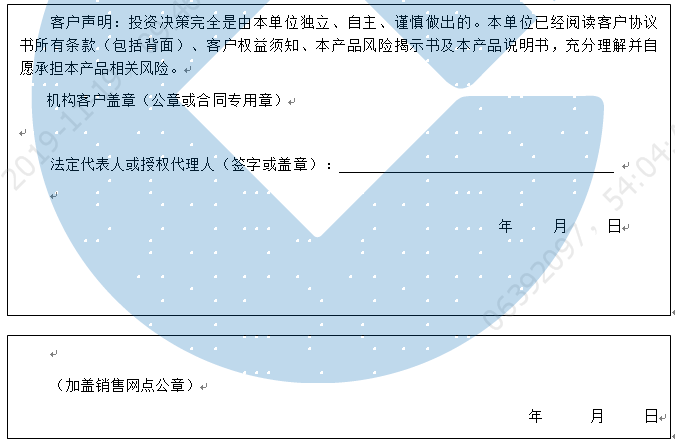 客户签名: ( 客户声明:投资决策完全是由客户独立、自主、谨慎做出的。客户已经阅读客户协议书所有条款(包括背面)、客户权益须知、本产品风险揭示书及本产品说明书,充分理解并自愿承担本产品相关风险。)