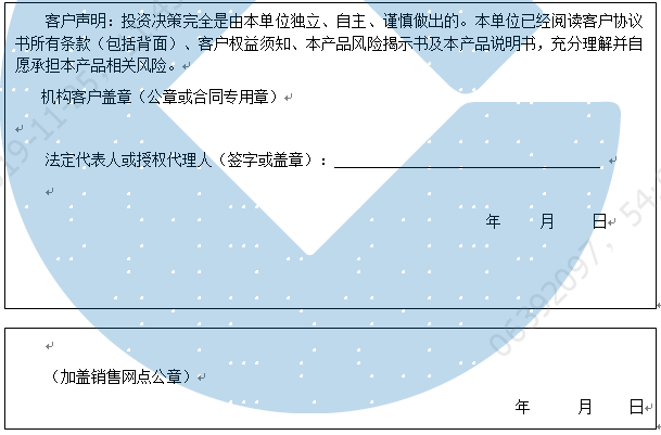 客户签名: ( 客户声明:投资决策完全是由客户独立、自主、谨慎做出的。客户已经阅读客户协议书所有条款(包括背面)、客户权益须知、本产品风险揭示书及本产品说明书,充分理解并自愿承担本产品相关风险。)