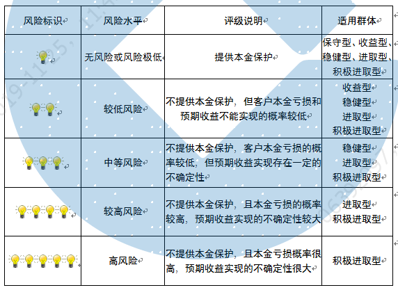 本产品为非保本浮动收益型理财产品,不保证本金和收益,请您充分认识投资风险,谨慎投资。本期产品期限为125天(中国建设银行有权对产品进行展期或提前终止),存续期内,产品不接受申购或赎回申请。本期产品内部风险评级级别为二盏警示灯 ,风险水平属于较低风险。最不利情况下,您将损失全部收益甚至包括全部本金。本理财产品适用于收益型、稳健型、进取型 、积极进取型客户。