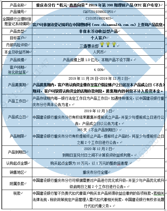 本产品为非保本浮动收益型理财产品,不保证本金和收益,请您充分认识投资风险,谨慎投资。本期产品期限为365天(中国建设银行有权对产品进行展期或提前终止),存续期内,产品不接受申购或赎回申请。本期产品内部风险评级级别为三盏警示灯 ,风险水平属于中等风险。最不利情况下,您将损失全部收益甚至包括全部本金。本理财产品适用于稳健型、进取型 、积极进取型客户。