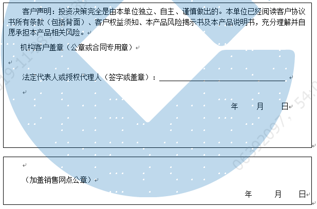 客户签名: ( 客户声明:投资决策完全是由客户独立、自主、谨慎做出的。客户已经阅读客户协议书所有条款(包括背面)、客户权益须知、本产品风险揭示书及本产品说明书,充分理解并自愿承担本产品相关风险。)