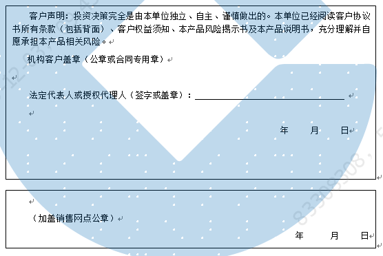 客户签名: ( 客户声明:投资决策完全是由客户独立、自主、谨慎做出的。客户已经阅读客户协议书所有条款(包括背面)、客户权益须知、本产品风险揭示书及本产品说明书,充分理解并自愿承担本产品相关风险。)
