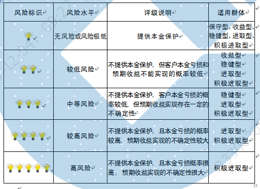 本产品为非保本浮动收益型理财产品,不保证本金和收益,请您充分认识投资风险,谨慎投资。本期产品期限为364天(中国建设银行有权对产品进行展期或提前终止),存续期内,产品不接受申购或赎回申请。本期产品内部风险评级级别为三盏警示灯,风险水平属于中等风险。最不利情况下,您将损失全部收益甚至包括全部本金。本理财产品适用于稳健型、进取型 、积极进取型客户。