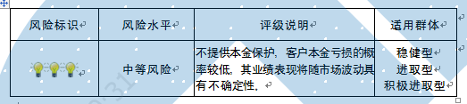 本产品为封闭式净值型理财产品,不保证本金和收益,请您充分认识投资风险,谨慎投资。本产品任何业绩比较基准、测算收益或类似表述均属不具有法律约束力的用语,不代表客户可能获得的实际收益,亦不构成中国建设银行重庆市分行对本产品的任何收益承诺。产品期限为固定期限(中国建设银行重庆市分行有权提前终止产品),存续期内产品不接受赎回申请。 本期产品内部风险评级级别为三盏警示灯 ,风险程度属于中等风险,适用于稳健型、进取型和积极进取型客户。最不利情况下,本期产品投资的资产无法回收任何本金和净收益,客户将损失全部本金。投资者不得使用贷款、发行债券等筹集的非自有资金投资本产品。如影响您风险承受能力的因素发生变化,请及时完成风险承受能力评估。