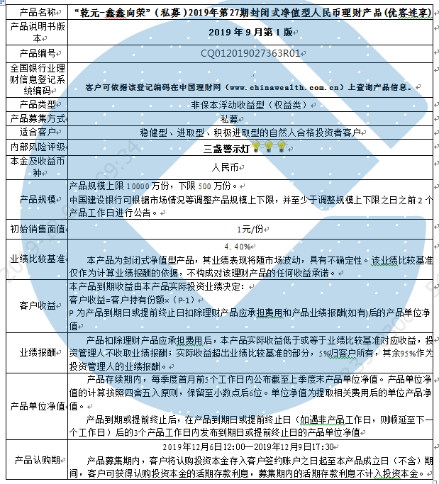 2019年第27期封闭式净值型人民币理财产品说明书