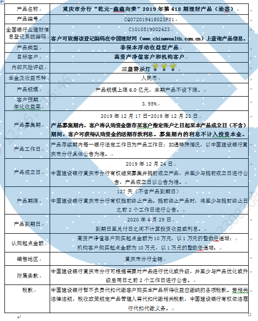 3.中国建设银行重庆市分行可根据市场情况等调整产品规模上、下限,并最迟于调整规模上下限当日进行公告。