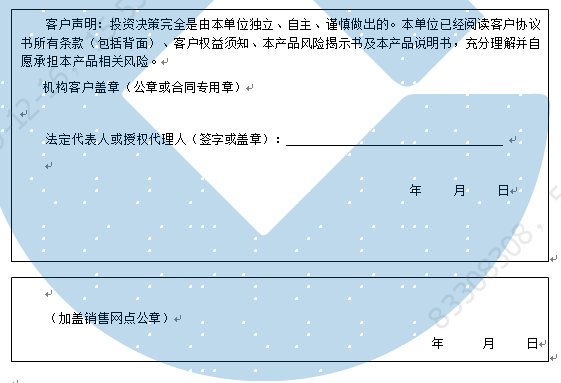 客户签名: ( 客户声明:投资决策完全是由客户独立、自主、谨慎做出的。客户已经阅读客户协议书所有条款(包括背面)、客户权益须知、本产品风险揭示书及本产品说明书,充分理解并自愿承担本产品相关风险。)