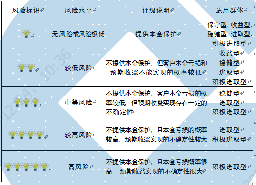 本期产品内部风险评级级别为三盏警示灯,风险程度属于中等风险。产品适合于稳健型、进取型及积极进取型客户。最不利情况下,基础资产无法回收任何本金和收益,客户将损失全部本金。客户不得使用贷款、发行债券等筹集的非自有资金投资本产品。