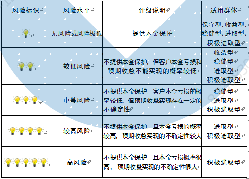 本期产品内部风险评级级别为三盏警示灯,风险水平属于中等风险。产品适合于稳健型、进取型 、积极进取型客户。最不利情况下,基础资产无法回收任何本金和收益,客户将损失全部本金。客户不得使用贷款、发行债券等筹集的非自有资金投资本产品。