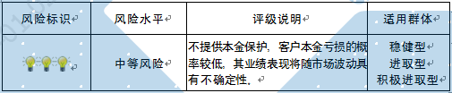5.管理风险:本产品资金将投资于货币市场类和权益类资产。管理人将秉承稳健经营的传统,发挥自身优势,为产品运作管理提供专业的投资管理服务,力争帮助客户实现收益;在产品运作过程中,由于产品管理人的知识、经验、技能、判断力、执行力等主观方面的限制,可能对产品的运作及管理造成一定影响,并因此影响客户收益,甚至造成本产品单位净值跌破面值、本金损失。