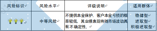 本产品为封闭式净值型理财产品,不保证本金和收益,请您充分认识投资风险,谨慎投资。本产品任何业绩比较基准、测算收益或类似表述均属不具有法律约束力的用语,不代表客户可能获得的实际收益,亦不构成中国建设银行重庆市分行对本产品的任何收益承诺。产品期限为固定期限(中国建设银行重庆市分行有权提前终止产品),存续期内产品不接受赎回申请。 本期产品内部风险评级级别为三盏警示灯,风险程度属于中等风险,适用于稳健型、进取型和积极进取型客户。最不利情况下,本期产品投资的资产无法回收任何本金和净收益,客户将损失全部本金。投资者不得使用贷款、发行债券等筹集的非自有资金投资本产品。如影响您风险承受能力的因素发生变化,请及时完成风险承受能力评估。