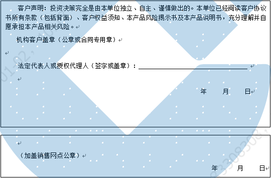客户签名: ( 客户声明:投资决策完全是由客户独立、自主、谨慎做出的。客户已经阅读客户协议书所有条款(包括背面)、客户权益须知、本产品风险揭示书及本产品说明书,充分理解并自愿承担本产品相关风险。)