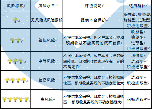 本期产品内部风险评级级别为三盏警示灯,风险水平属于中等风险。产品适合于稳健型、进取型 、积极进取型客户。最不利情况下,基础资产无法回收任何本金和收益,客户将损失全部本金。客户不得使用贷款、发行债券等筹集的非自有资金投资本产品。