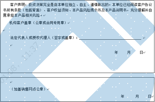 客户签名:                                    客户声明:投资决策完全是由客户独立、自主、谨慎做出的。客户已经阅读客户协议书所有条款(包括背面)、客户权益须知、本产品风险揭示书及本产品说明书,充分理解并自愿承担本产品相关风险。)